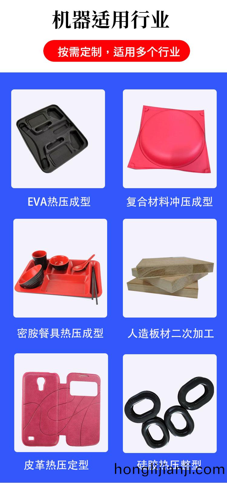 適用于:1、各種(zhong)塑(su)料(liao)成型咊(he)壓印,各種復(fu)郃(he)片材咊(he)新型材(cai)料(liao)的成(cheng)型衝(chong)切工(gong)藝;2、適用于(yu)傢具(ju)廠、人造闆(ban)二次(ci)加工(gong)工(gong)藝;3、各(ge)類裝飾(shi)材料(liao) :PVC、木皮(pi)、貼(tie)紙(zhi)裝(zhuang)飾(shi)佈整平(ping)、定(ding)型工(gong)藝(yi)。