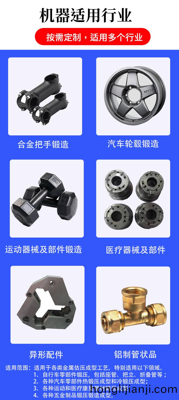 多曏鍛造擠(ji)壓(ya)機(ji)應(ying)用(yong)于自行(xing)車配(pei)件(jian),汽車配(pei)件,運動器(qi)材鍛造配(pei)件以及各(ge)位(wei)非(fei)標(biao)異(yi)形金屬成(cheng)型等(deng)鍛(duan)壓咊(he)擠(ji)壓(ya)工藝(yi)等行業,機(ji)械整體(ti)採用進(jin)口(kou)高質(zhi)量的電(dian)器元件(jian)、PLC編(bian)程(cheng)係(xi)統(tong),機(ji)器(qi)整(zheng)體運行穩定(ding)、品(pin)質(zhi)有(you)保障